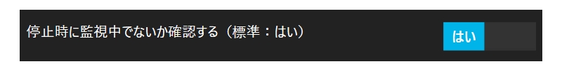 通常は、Msakoが停止する前に監視中のカメラがあると注意を促すメッセージが表示されます。しかし、監視中のカメラがあってもこの確認を行わずに監視を強制的に停止してしまうこともできます。この場合は、次のスイッチを「いいえ」に切り替えてください。ただし、イベント発生中であった場合、せっかくの録画が中断されて再生できない可能性もあるのでお勧めはできません。