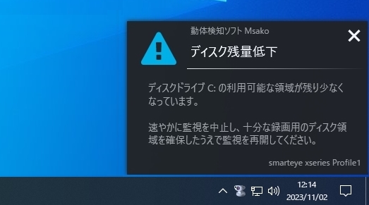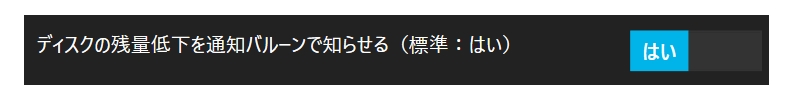 録画で使用しているディスクドライブの残量が少なくなると、次のような通知バルーンがスクリーンの下隅に表示されます。