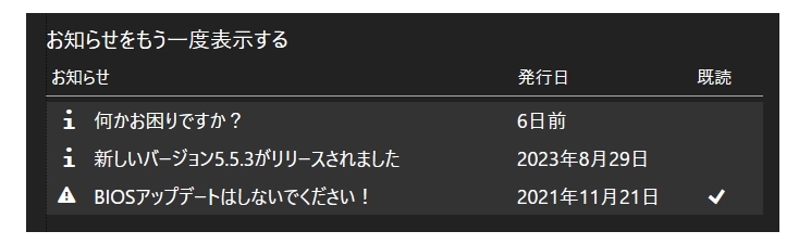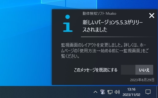 バージョンアップなど各種のお知らせをスクリーンの下隅に通知バルーンで表示します。