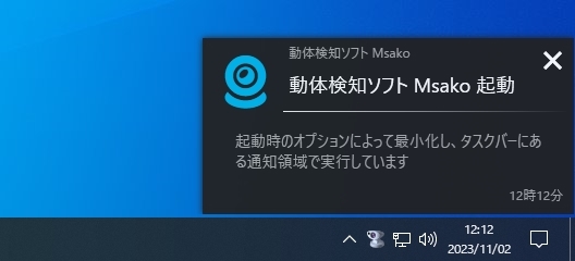 タスクバーの通知領域に最小化して起動すると、次のような通知バルーンがスクリーンの下隅に表示されます。