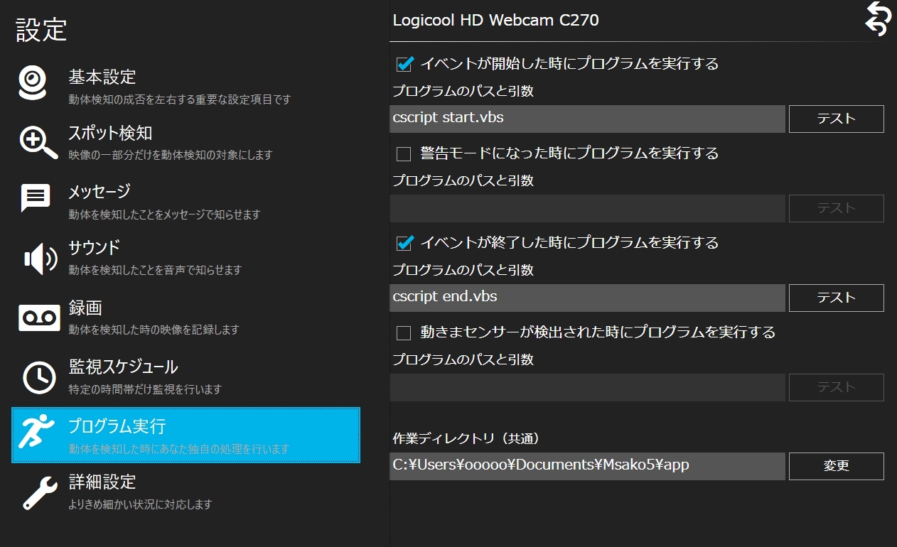 設定画面の「プログラム実行」を開いて、あなたが作成したプログラムをあらかじめ設定しておくと、Msakoが動体を検知したときに、このプログラムが自動的に実行されます。