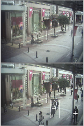 日照や気象、人的な活動などによって、背景は時々刻々変化します。動きが散発的な映像ならば背景を作成するのは容易にできますが、下の例の雑踏のように、目まぐるしく物が動き背景も変化する状況では工夫が必要です。ベンチのわきに立っている男性は、この時点では背景になっていますが、この場所に立つまでは背景ではなく動体であり、また再び歩き出した後も動体となります。この背景は、後から画像編集ソフトなどを使って加工、修正、合成して作ったものではなく、Msakoがリアルタイムに計算して作成したものです。そして、Msakoはこの背景と生の画像を比べて異なる部分を動体として認識します。