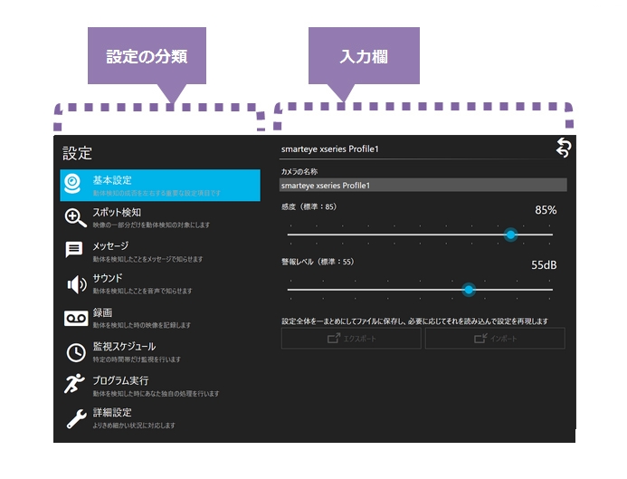 監視に関する設定はこの画面で行います。設定画面は左右2つの領域に分かれています。