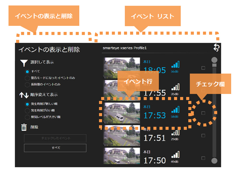 イベント リストには検知されたイベントが表示されます。イベントの表示と削除を操作することによって、イベント リストに表示するイベントを選別、順序付けしたり、選択したイベントを削除します。