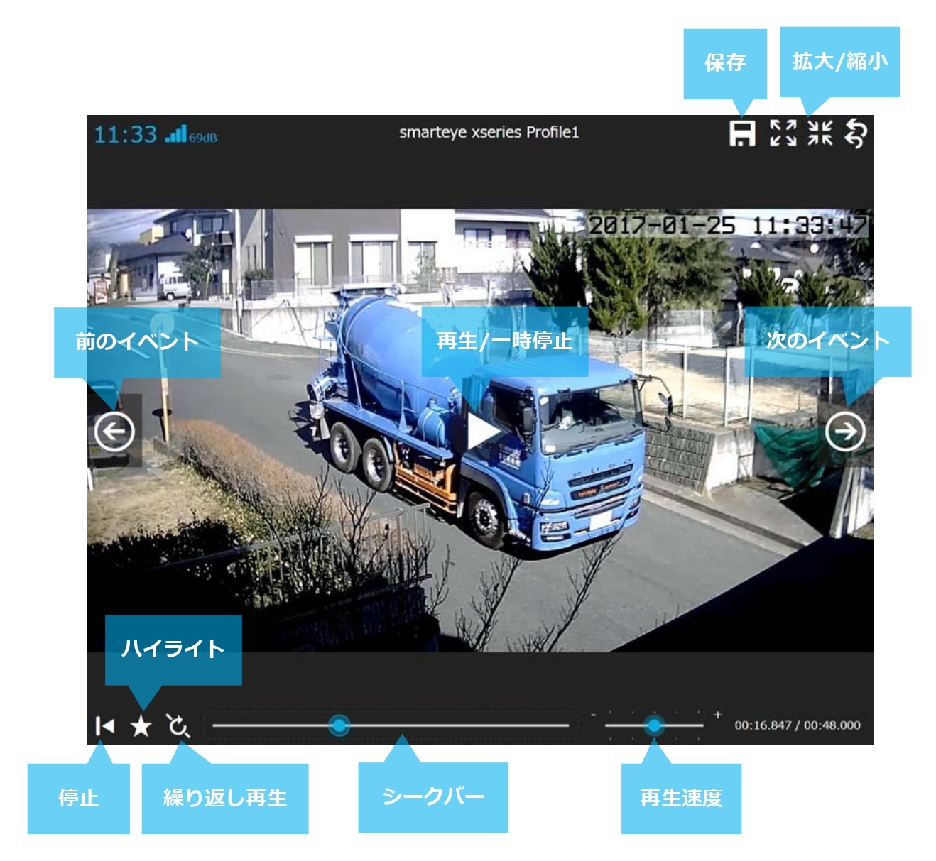 イベント一覧のイベント行をクリックすると、再生画面が表示されます。この画面では、選択したイベントの動画を再生することができます。操作は一般的なメディアプレーヤと変わりありません。ハイライトボタンは、イベントの中で一番検知レベルが大きかったフレーム、言い換えればもっとも特徴的な場面、を表示します。