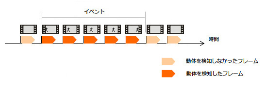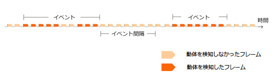 イベントとイベントの間には、動体を検知しない時間があります。ある一定時間以上動体を検知しなかったならば、言い換えれば、ある一定時間以上検知フレームが途切れた場合、1つのイベントが終了したとみなします。この一定時間のことをイベント間隔と呼びます。このイベント間隔は、詳細設定で変更できます。