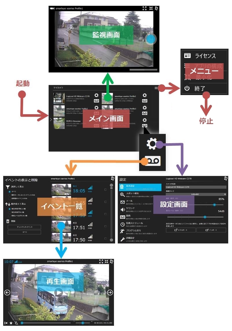 メイン画面のマイカメラにある各カメラをクリックすると、そのカメラの監視画面、設定画面、イベント一覧が表示されます。さらに、イベント一覧のイベント行をクリックすると、選択したカメラで発生したイベントの再生画面が表示されます。