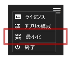 最小化するためには、次のようにメイン画面の右上隅にあるメニューの中から「最小化」を選択します。