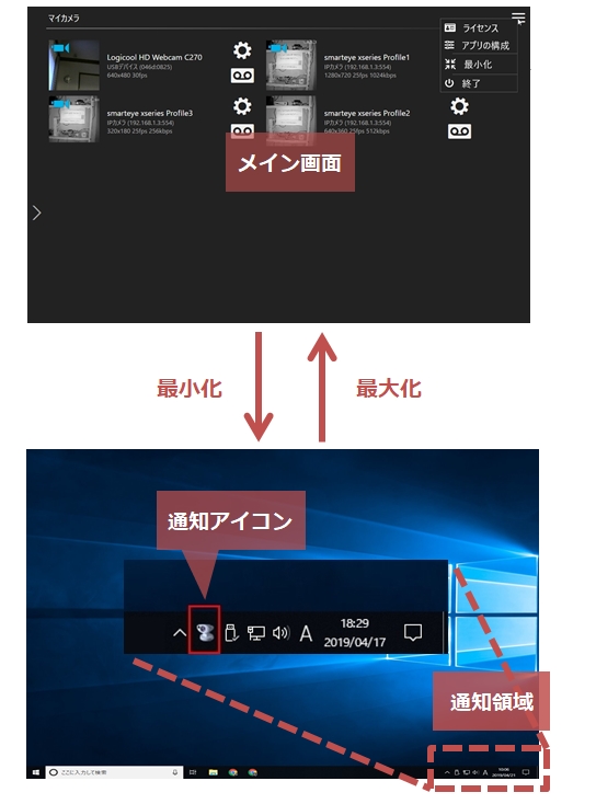 メイン画面を小さなアイコンの状態にして通知領域 の中に入れてしまうことを最小化と呼び、このアイコンを通知アイコンと呼びます。一方、モニタースクリーンいっぱいに大きくした状態にすることを最大化と呼びます。これら2つの状態は外見が違うだけで、どちらもMsakoが実行していることに違いはありません。