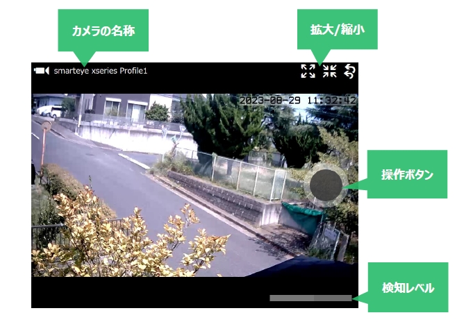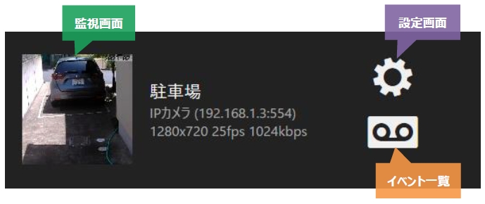 マイカメラには、カメラごとに次のように表示されます。さらにこの各部をクリックすると、そのカメラの監視画面、設定画面、イベント一覧を表示します。
