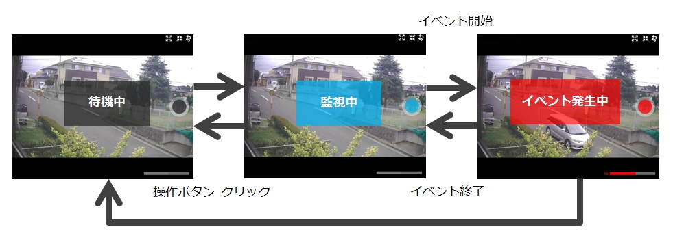カメラは最初、待機中の状態です。この状態では、動体を検知しても何もしません。操作ボタンを押すと監視中の状態に変化します。この状態で動体を検知するとイベントが発生してイベント発生中になり、あらかじめ設定しておいた処理、例えば録画やメール送信などの処理を行います。動体を検知しなくなると再び監視中の状態に戻ります。