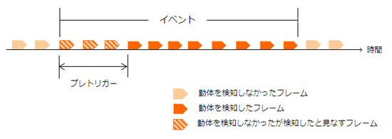 動体を検知する前の数フレームもイベントの一部とみなしてイベントに含めることができます。これをプレトリガーと呼びます。このプレトリガーは、詳細設定で変更できます。