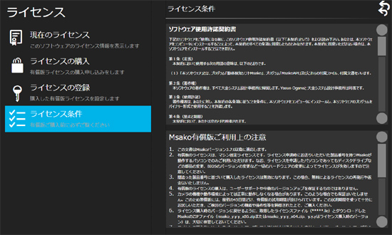 まず、ライセンス画面の左側にある「ライセンス条件」を選択してください。すると画面右半分が切り替わって「ソフトウェア使用許諾契約書」と「Msako有償版ご利用上の注意」が表示されます。必ずこの2つの文書をお読みください。