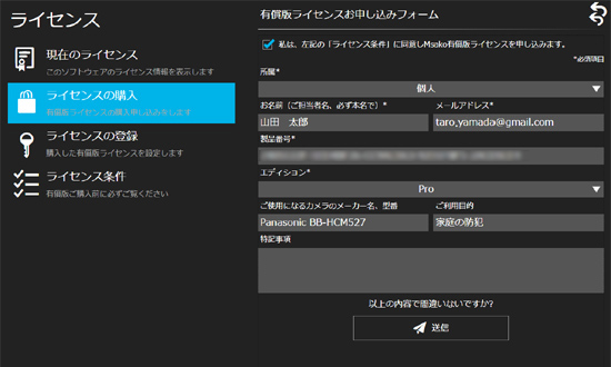 最後に「 送信」をクリックするとお申し込みの内容がライセンスサーバーに送信されます。