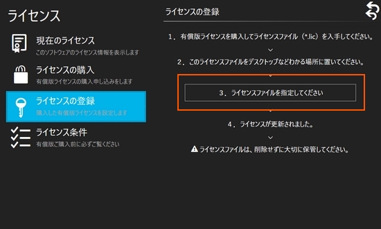 まず手順①と同じ要領でライセンス画面の「ライセンスの登録」を表示します。この画面右半分にある「ライセンスファイルを指定してください」をクリックしてください。