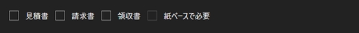 個人以外のお申し込みに限り見積書、請求書、納品書を発行いたします。必要な項目にチェックを入れてください。