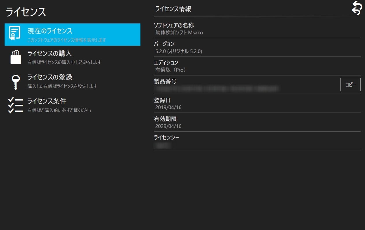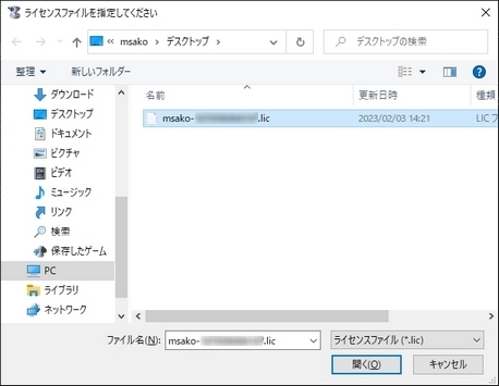 指定したライセンスファイルの検査が行われ、問題なければライセンスの登録が完了し、次のように表示されます。なお、登録した新しいライセンスは次回Msakoを起動した時に有効となりライセンス画面の「現在のライセンス」で確認することができます。
