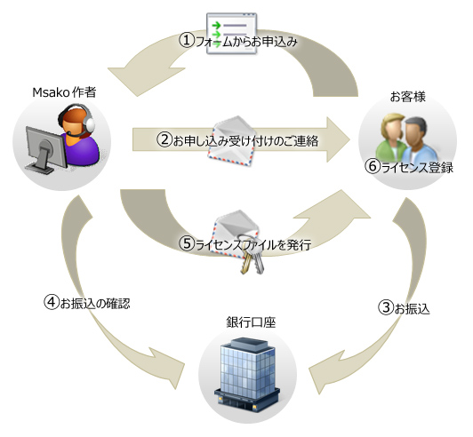 有償版ライセンスのご購入の手続きは、下記の①から⑥の手順でお願いします。この手順以外をご希望の場合、できる限り対応いたしますので、どうぞご遠慮なくお問い合わせください。