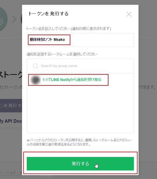 次の設定画面が表示されます。ここで「トークン名」として自分がわかりやすい名前、例えば「動体検知ソフト Msako」などと記入し、Msakoのイベント発生の通知先となる「トークルーム」を選択します。「発行する」を押すとトークンが発行されます。
