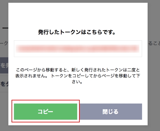 表示されたトークンは書き留めるのが大変なほど長い文字列でしかも二度と表示されないとの事なので、必ず「コピー」を選んでクリップボードへ入れ、消えないようメモ帳などに転記してファイルに保存しておくこと。
