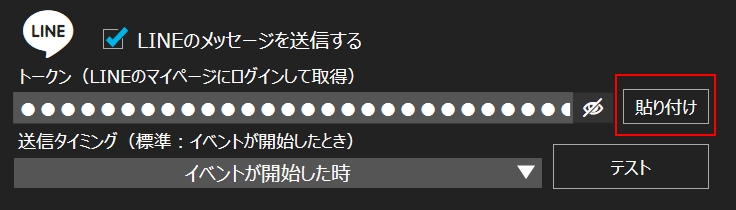 メッセージ画面に移動してトークン入力欄の右側にある「貼り付け」ボタンを押すと、取得したトークンがトークン入力欄に設定されます。さらに、「テスト」ボタンを押すとLINEに通知が届くことが確認できます。