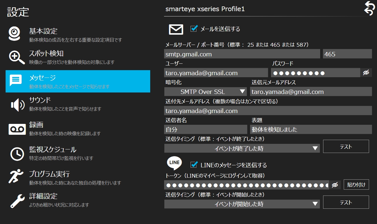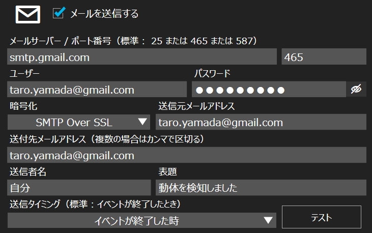 次の例では、Gmailのメールサーバを経由して、自分(taro.yamada)あてに動体検知のメールを送信します。ここでは、ざっとこんな感じというのを知っていただければ、すべて理解できなくてもかまいません。