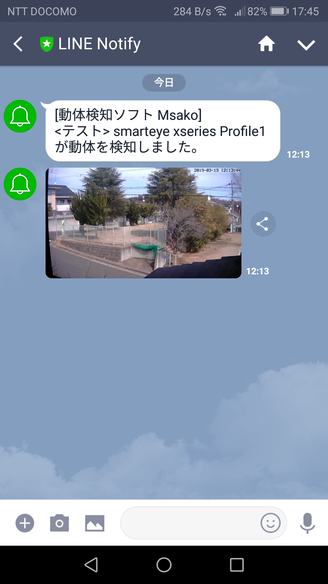 LINEによる通知の設定をすると、次の例のように動体を検知した事をLINEで知らせることができます。 ※1