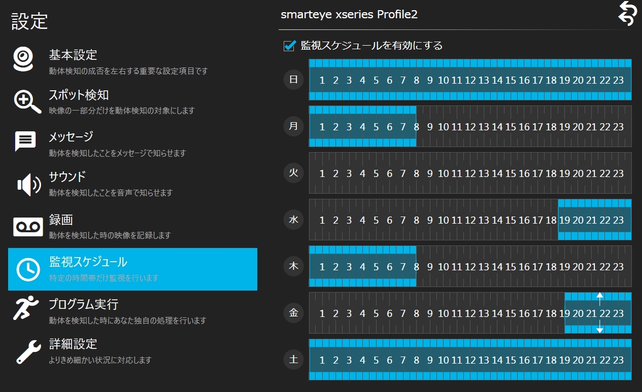 Msakoの動体検知を行う時間帯は設定画面の「監視スケジュール」で設定します。