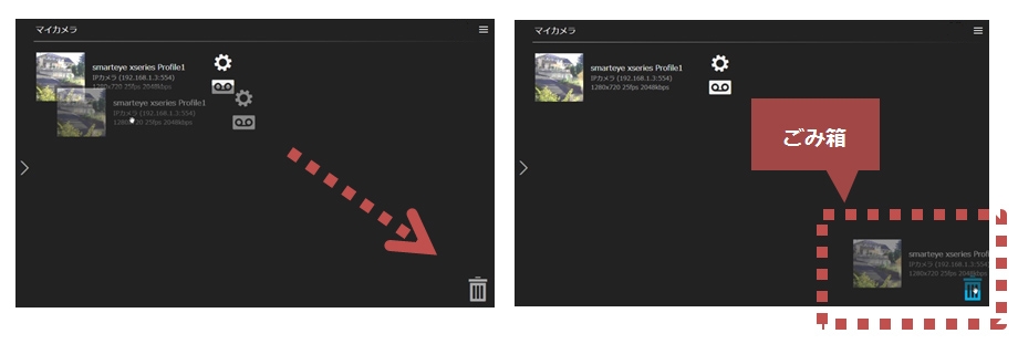 このようにして検出されたカメラの中で使用しないカメラは、次の図のようにドラッグして画面右下隅にあるごみ箱の上に落としてマイカメラから削除します。