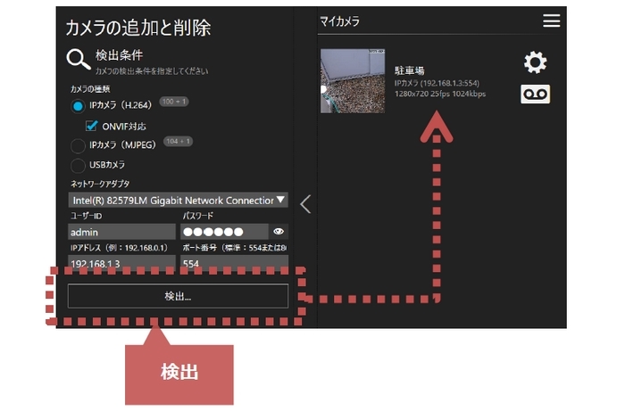 検出条件としてIPカメラを指定した場合、H.264、Motion JPEGそれぞれ100種類以上のネットワークカメラの定義の中からあなたのカメラに適合するものを探します。これに加えてさらに、ONVIF規格 の自動発見機能を使って、IPアドレスを指定しなくても、あなたのカメラを見つけ出そうとします。